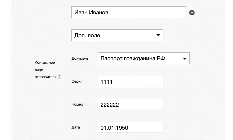Поле обязательно, если заказ оформляется физ.лицом и не указан номер ИНН юр.лица отправителя.