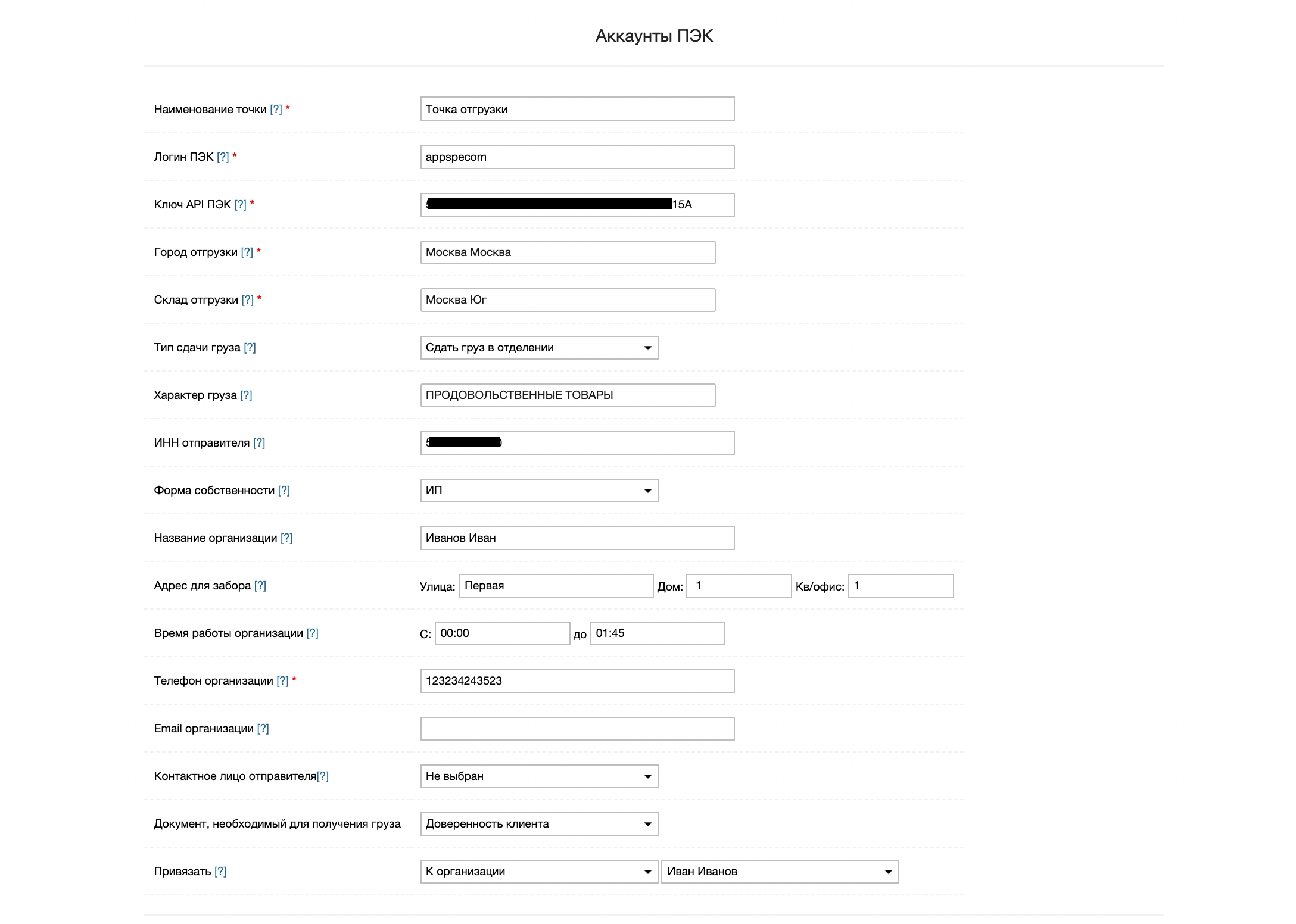 Ваше произвольное название для учетной записи. Эти данные не будут видны клиенту, Используется для выбора аккаунта ПЭК в виджете приложения, как Точка отгрузки