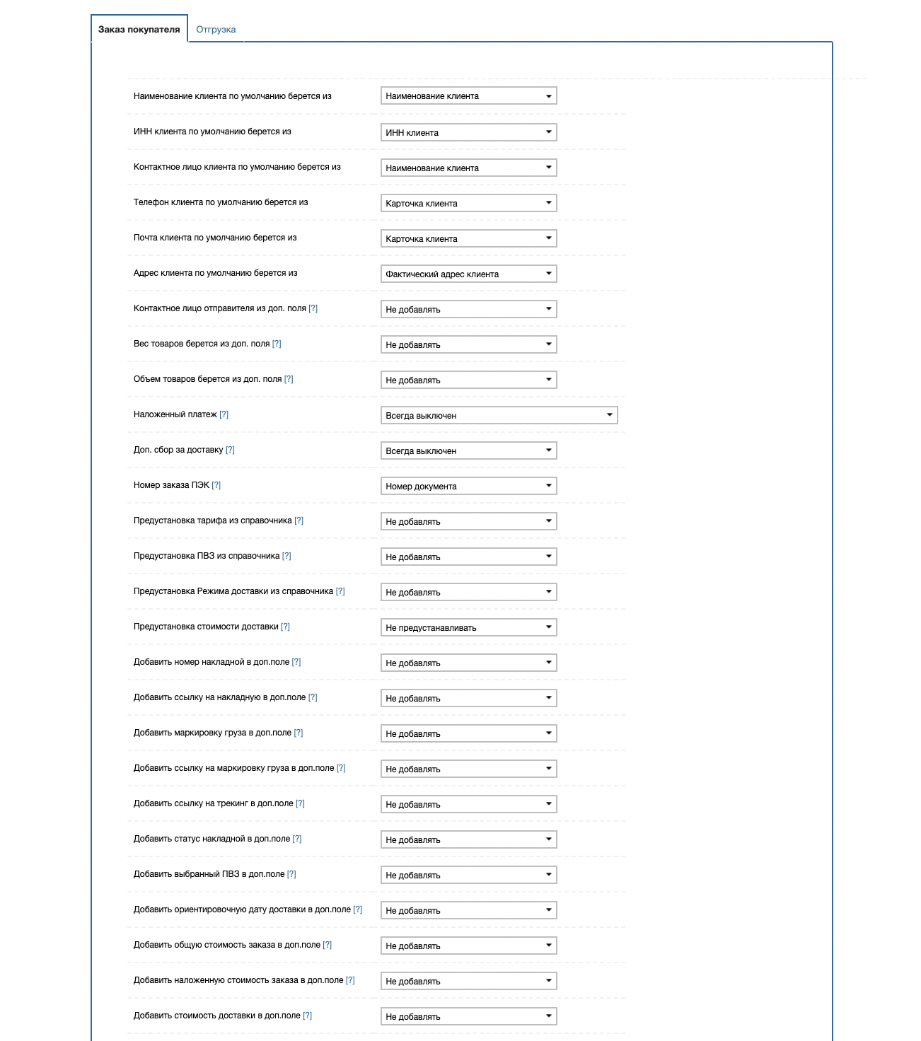 Этот раздел позволяет настроить работу приложения (выбор данных клиента, трансляцию статусов из ПЭК, передачу данных накладных в доп. поля).