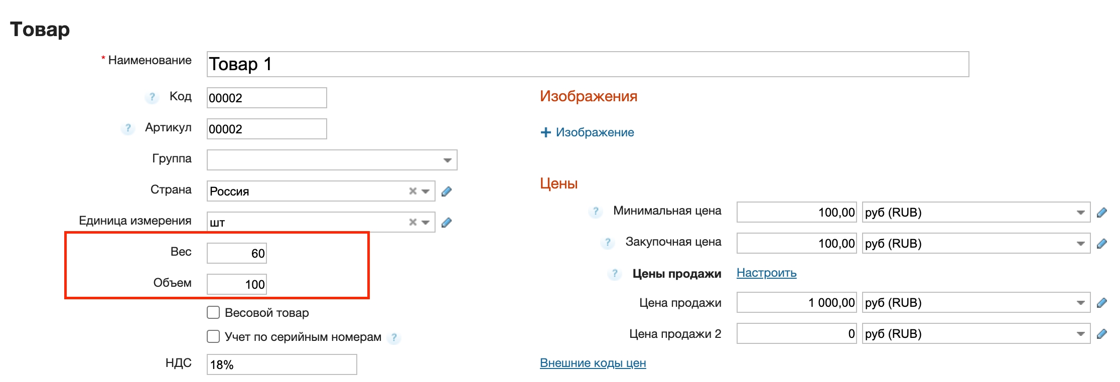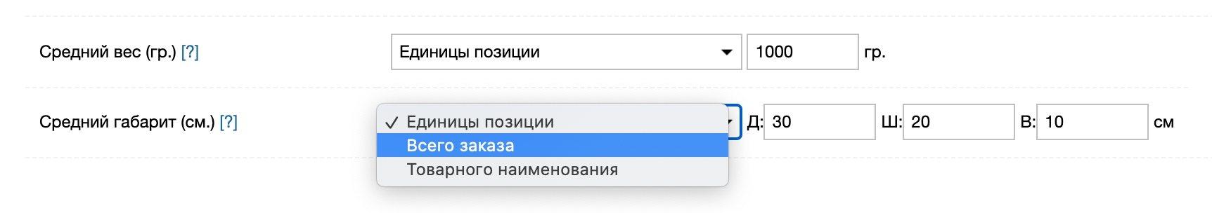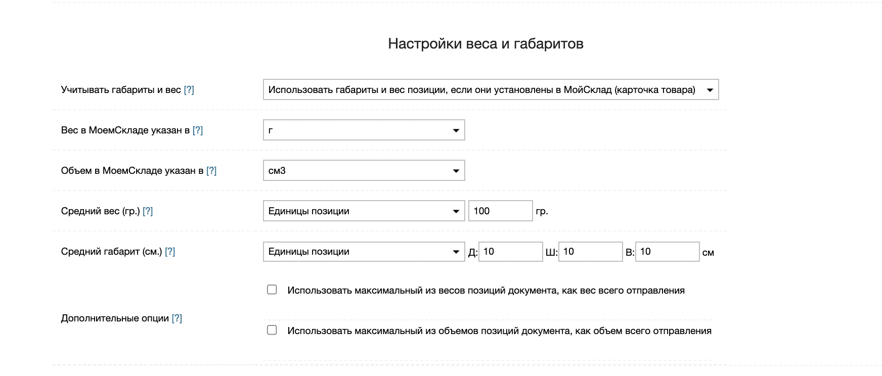 Использовать объем и вес позиции, если они установлены в МойСклад. В этом случае, приложение будет брать значения веса и габаритов из МоегоСклада, если они имеются в карточке товара (поля Вес и Объем, см скриншот ниже).