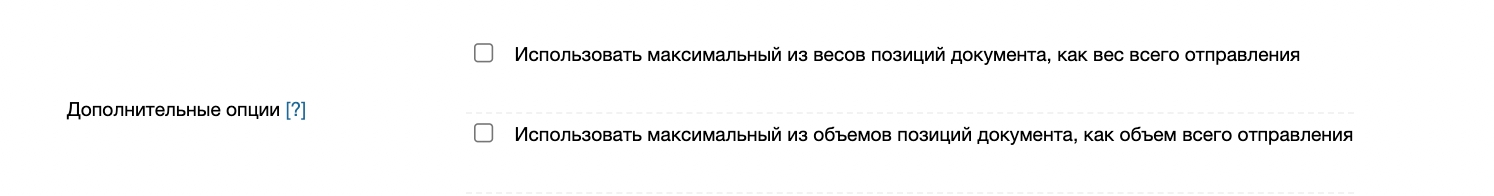 Данные опции могут применяться, при использовании в списке товаров документа упаковочного материала. В этом случае наибольший из объемов или весов позиций будет принят как объем или вес всего отправления. По умолчанию опции отключены.