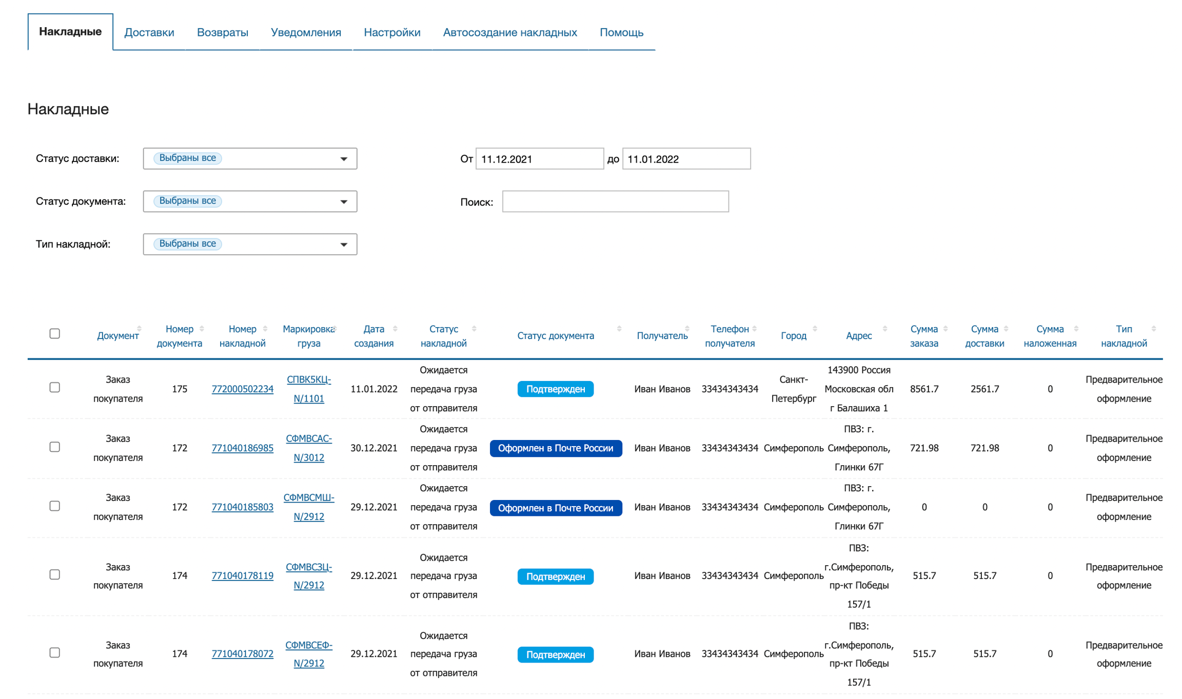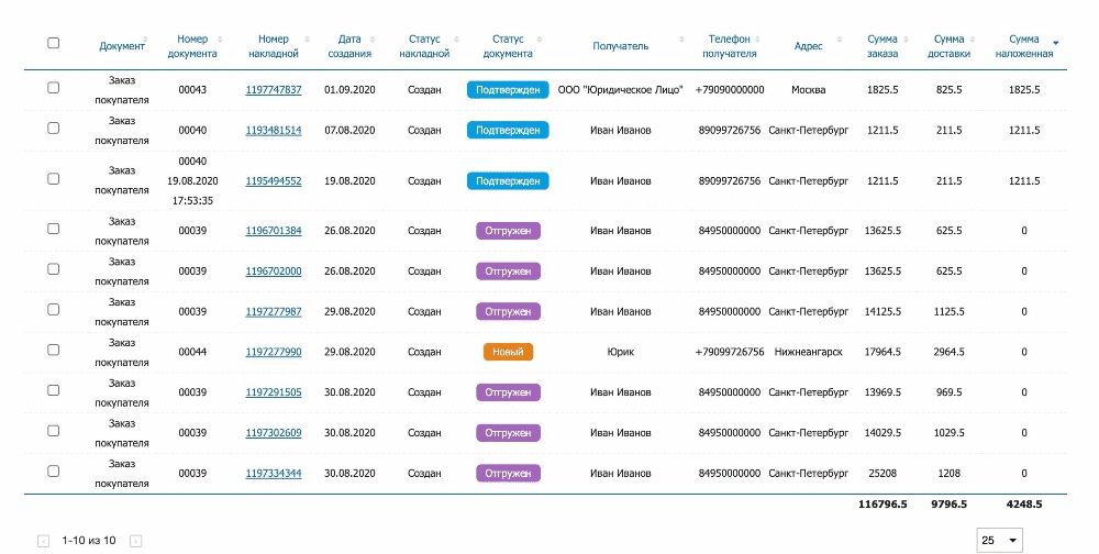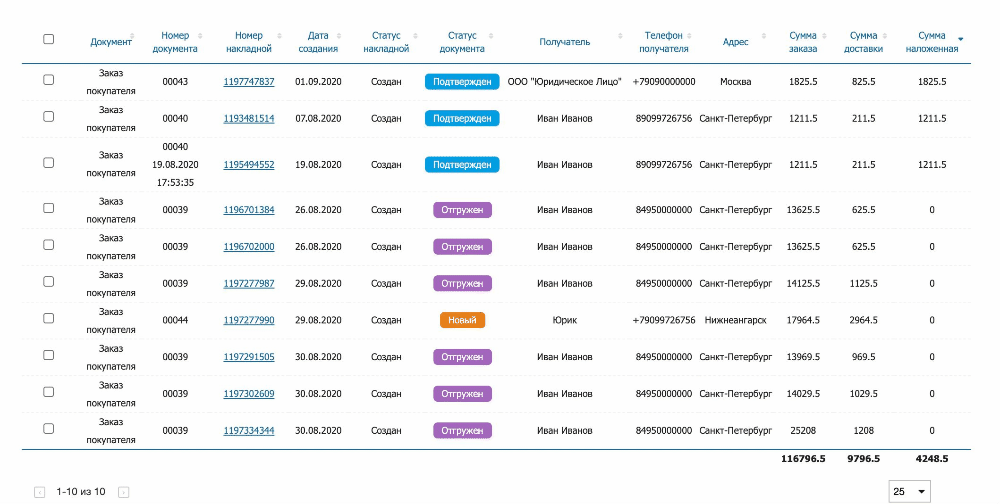 Во вкладке Накладные отображаются все созданные через виджет и автоматическое создание накладные, их текущие статусы, данные по доставке, суммарные стоимости наложенного платежа и т.д.