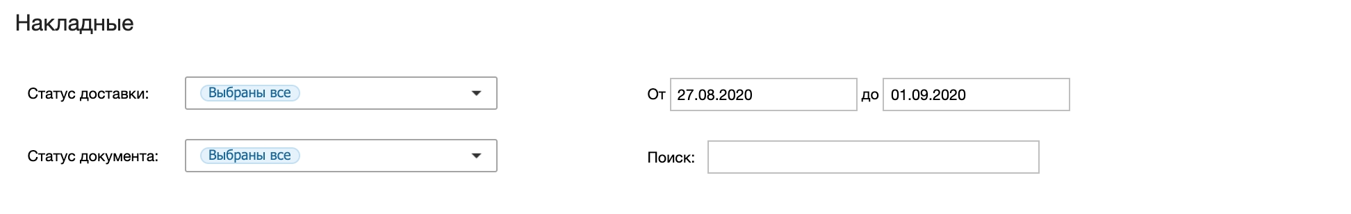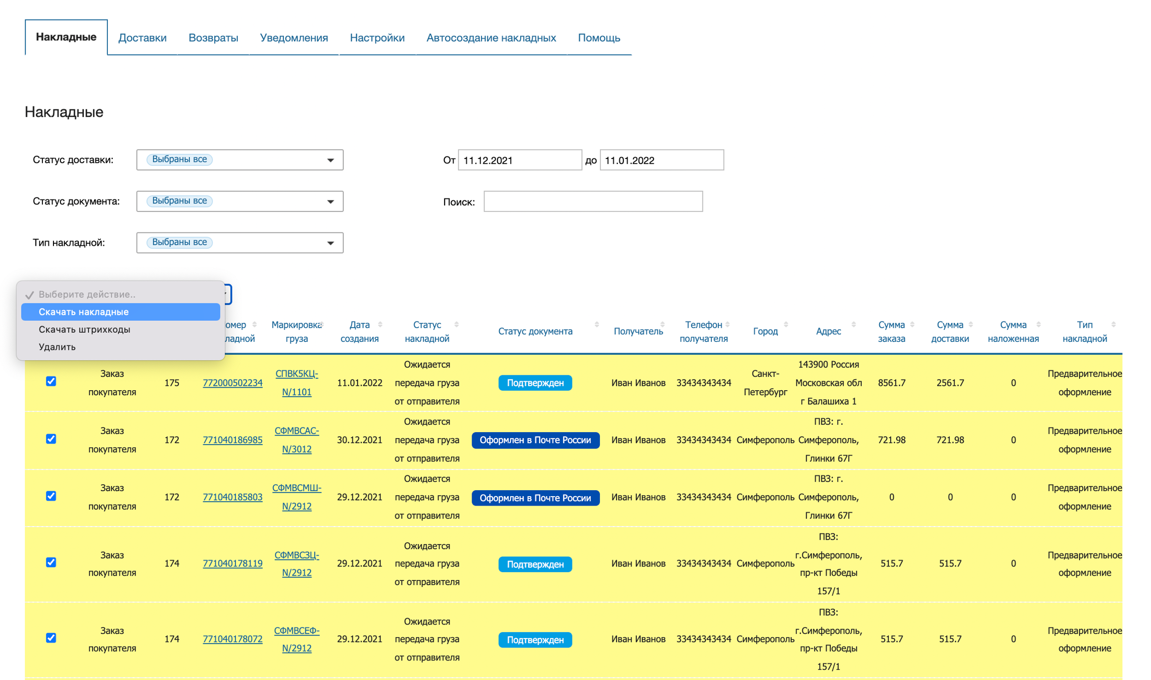 Накладные можно скачивать как единично, кликая на номер накладной, так и массово, выделив нужные накладные галочками и выбрав Cкачать накладные в выпадающем меню.