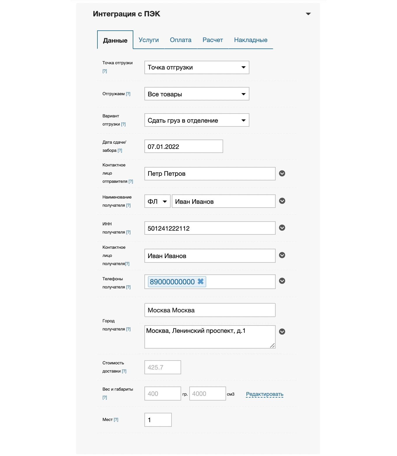 Услуги. Здесь пользователю предлагается решить какие услуги нужно включить при оформлении накладной ПЭК. В зависимости от настроек автоматически пересчитывается стоимость доставки.