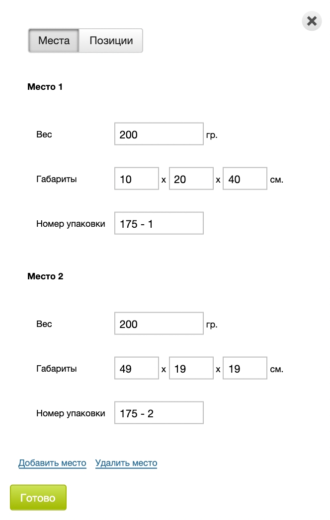 Этой опцией вы можете изменить количество мест в накладной, например когда по 1 заказу вы отправляете 2 коробки. При нажатии на Редактировать, вы можете указать габариты и вес мест: