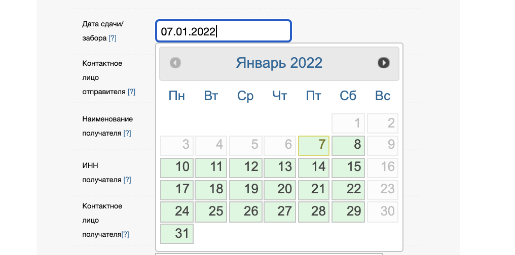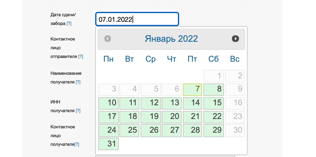 Пользователю предлагается выбрать в календаре предполагаемую дату сдачи или желаемую дату забора. Зеленым подсвечены доступные даты, серым - недоступные, красным - когда стоимость забора повышена.