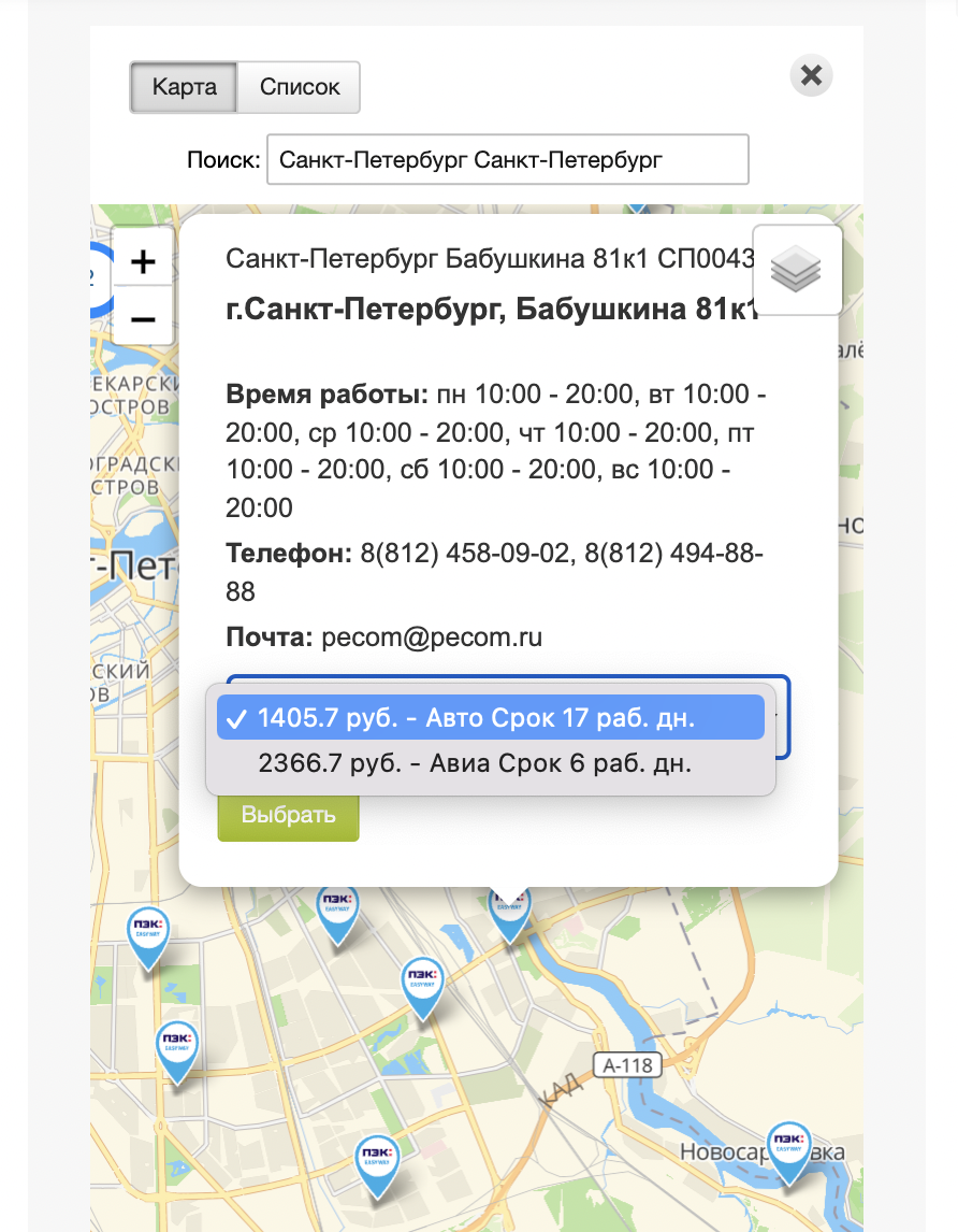 Помимо стоимости в расчетной части доступны выбор ПВЗ на карте, и контрольные сроки доставки по каждому из тарифов.