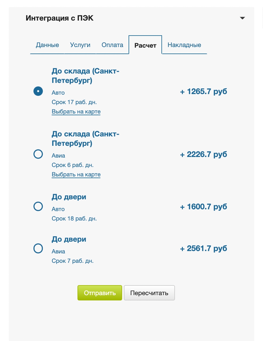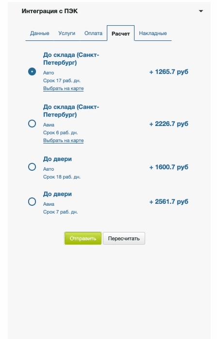 В этой части виджета выводятся точки ПВЗ и стоимость по тарифам, доступным для отправления по заданным параметрам из вкладки Данные заказа