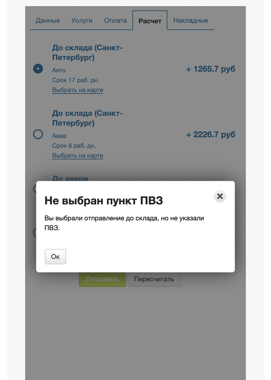 Если пользователь не выберет точку при заказе по тарифу До склада, он получит сообщение с предупреждением, а заказ не оформится.
