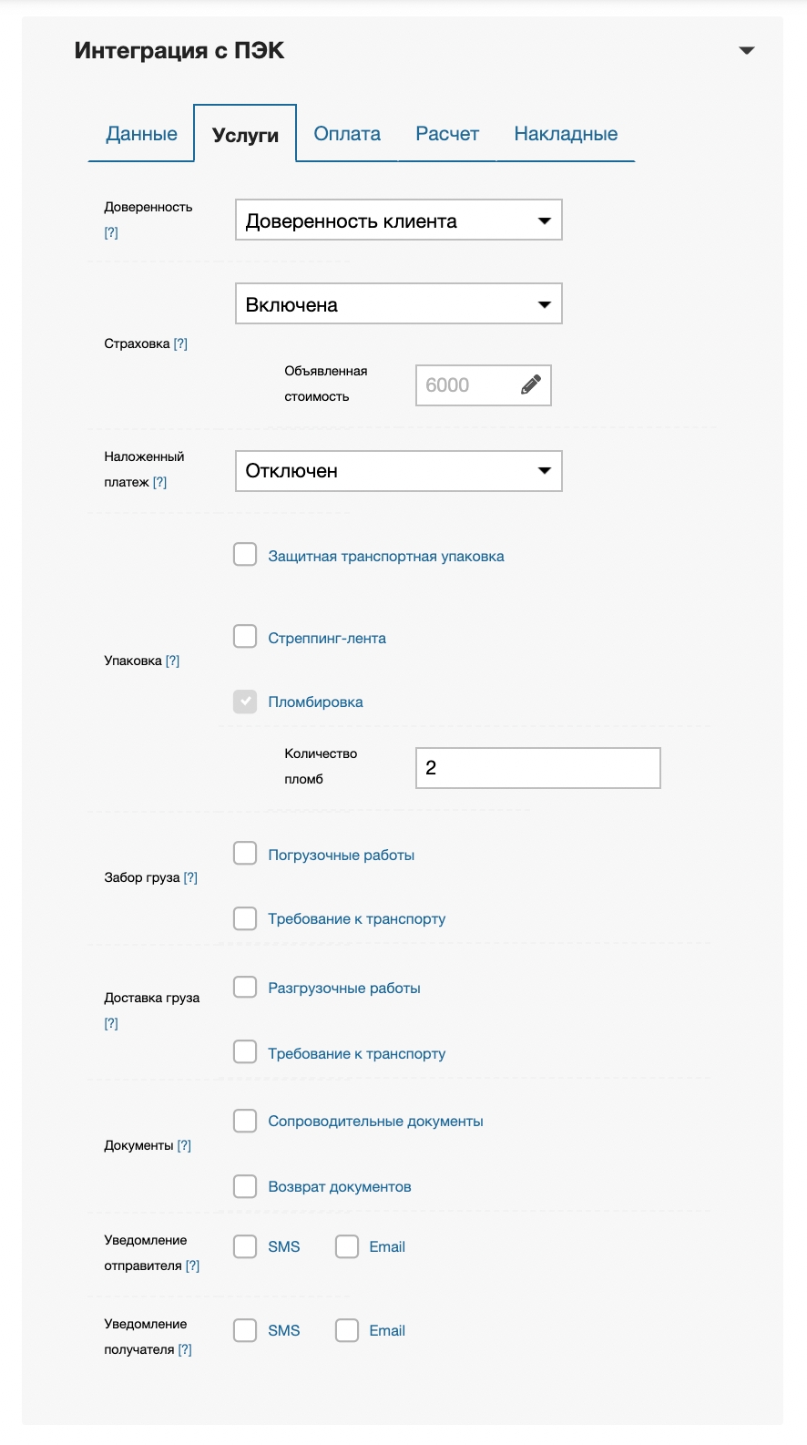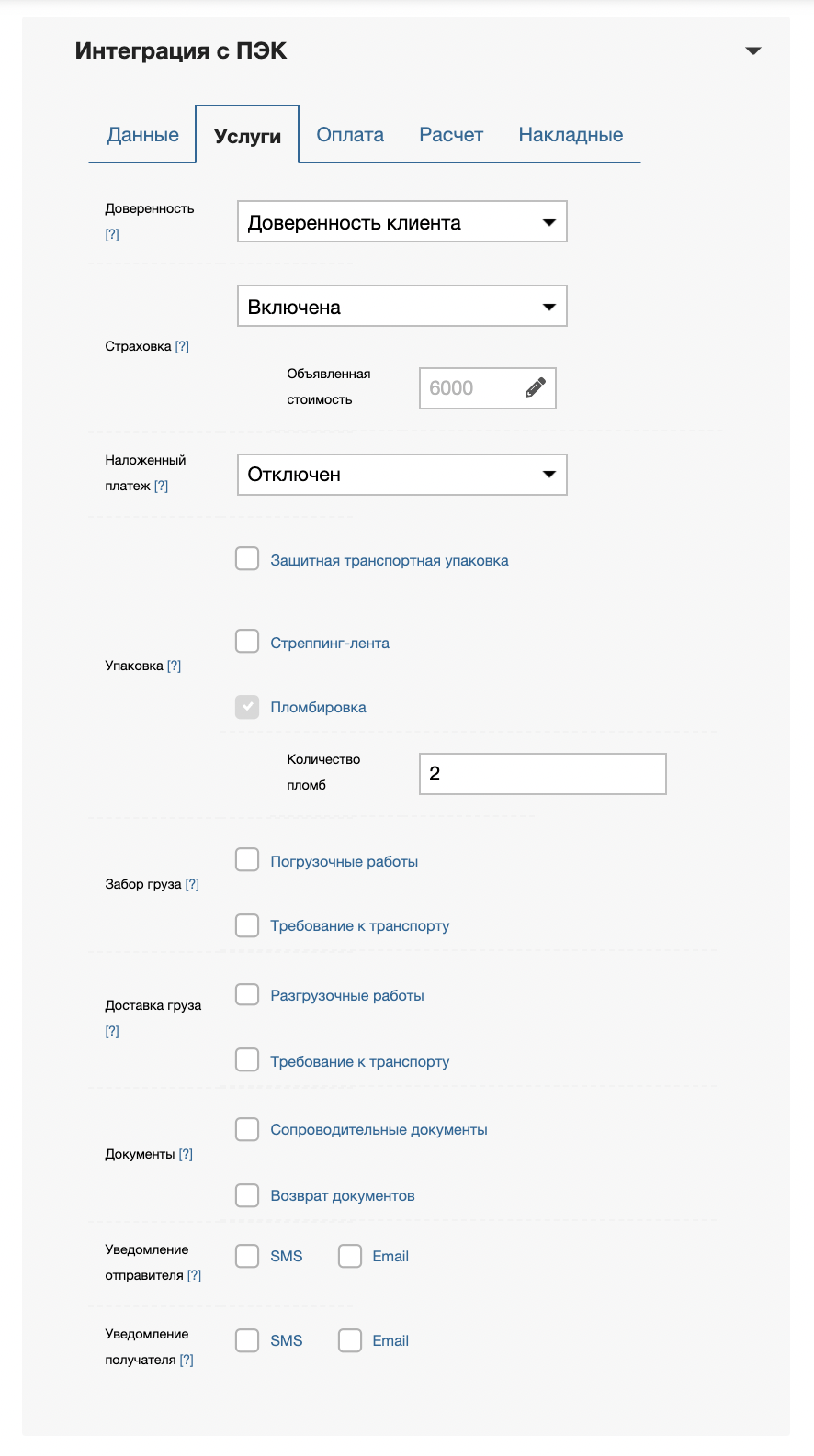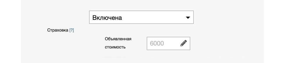 Опция позволяет включить страхование груза и указать объявленную стоимость. Подробнее про страхование груза в ПЭК.