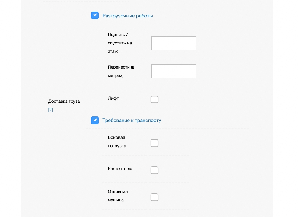 При разгрузке вы можете обозначить требования к транспорту. В зависимости от характеристик груза, города отправления и времени разгрузки услуга может тарифицироваться или нет. При включении опций - стоимость доставки автоматически пересчитается с учетом услуг.