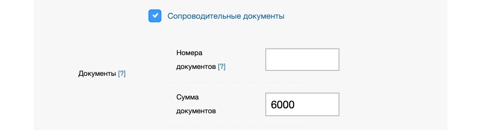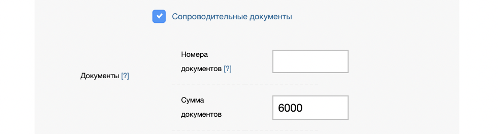 При включении опции обязательны к указанию номера и суммы сопроводительных документов
