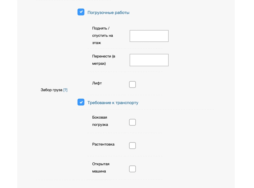 При погрузке вы можете обозначить требования к транспорту. В зависимости от характеристик груза, города отправления и времени погрузки услуга может тарифицироваться или нет. При включении опций - стоимость доставки автоматически пересчитается с учетом услуг.