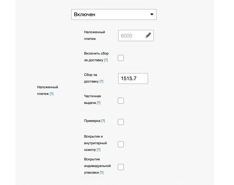 В этом разделе вы можете отредактировать сумму наложенного платежа и выбрать доп. услуги для этой опции.